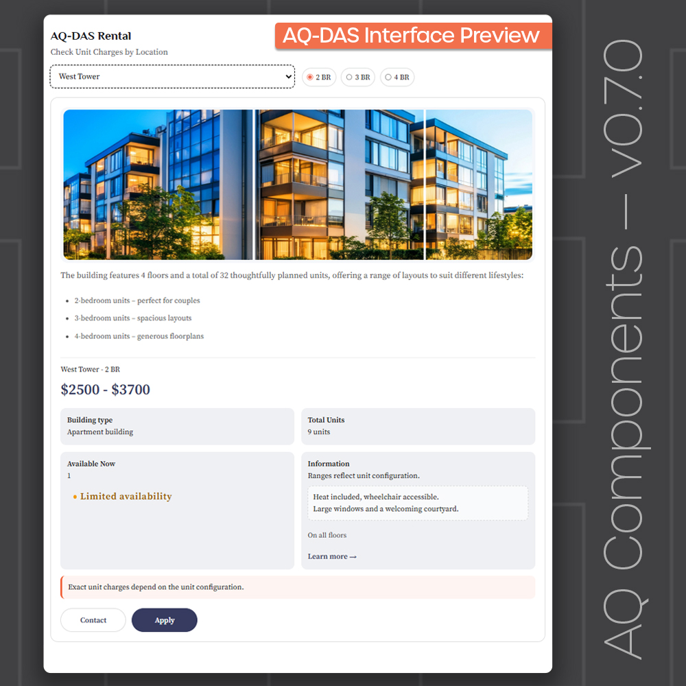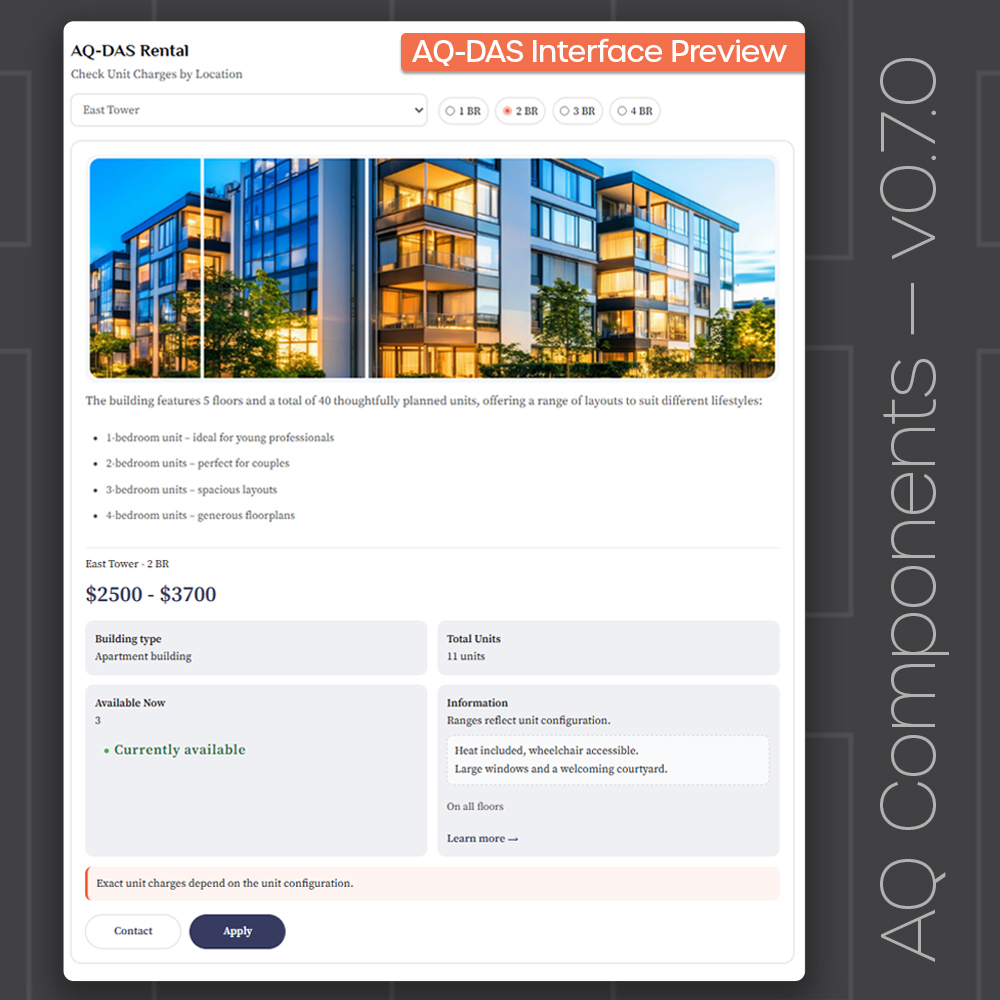 AQ Components is a modular WordPress plugin framework designed to turn structured data into clear, interactive experiences. Its first production-ready module, AQ-DAS, brings availability, pricing, and selection flows into a single user-friendly system.